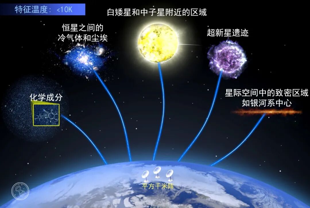 射电波可被用来观测漂浮在太空中的冷气体,此外通过分析波长,可以确定气体的构成物质;射电波也可被用于直接观测冷尘埃,冷尘埃在射电波段发出的光芒就像恒星在可见光波段发出的光芒一样。由于射电波的波长比其他波段的波要长,所以大多数射电辐射都能成功抵达地面,不会被地球的大气层所吸收。因此无论在白天还是夜晚,地基天文台都可以在这一波段进行观测。