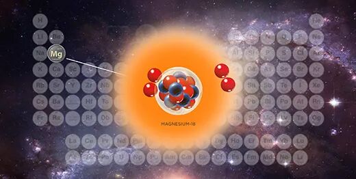 在地球上,镁的储量丰富,它们是我们饮食和地壳矿物质的重要组成部分。所有镁原子的原子核内都有12个质子,最常见的几种镁同位素分别是含有12、13、14个中子的镁-24(²⁴Mg)、镁-25(²⁵Mg)、镁-26(²⁶Mg),这三种同位素都很稳定,有着不会轻易“瓦解”的原子核。