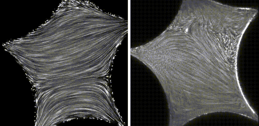 一种粘性流体穿过多孔介质,当流速较低时(左),流体流动平稳;但当流速变高时(右),流体中的聚合物会导致流体变得混乱,旋涡会不断的形成、增长和消失。| 动图来源:Datta Lab