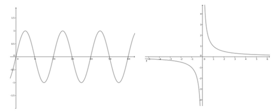○ 左图:多值的sin函数。右图:在x=0处存在奇点的函数1/x。