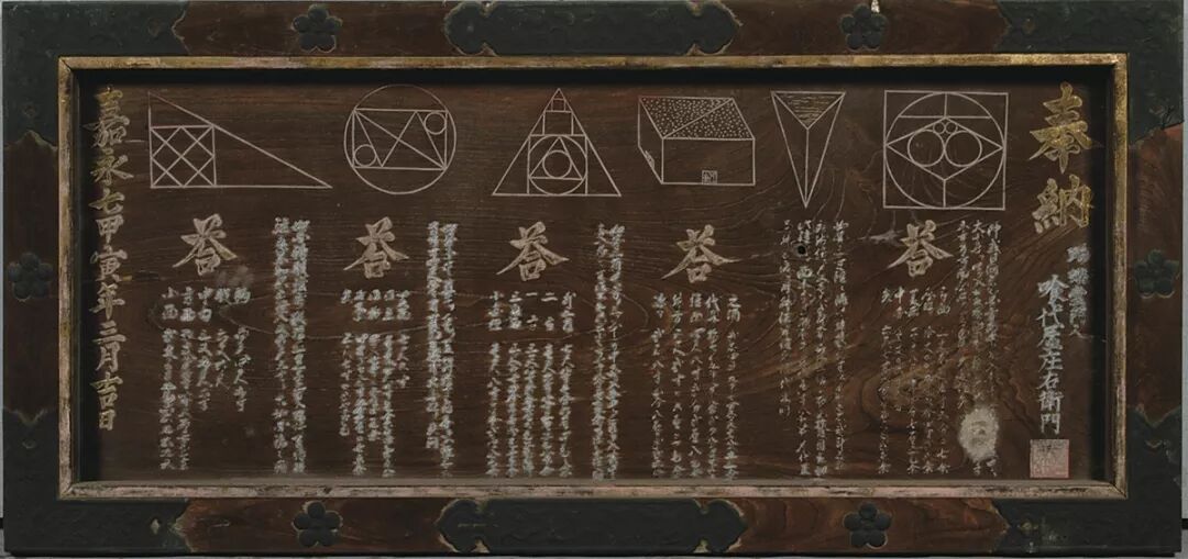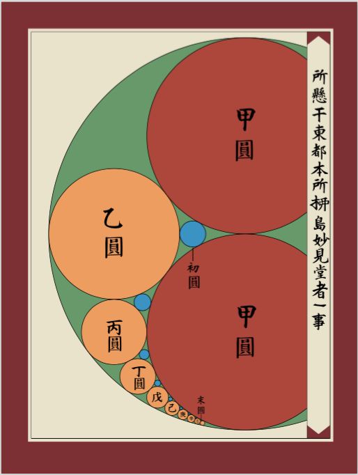 这个时代的日本人制作了许多彩色的木版画,上面描绘了各式各样的几何问题。这些木板被称为算额(sangaku),就是带有数学题的木板的意思。