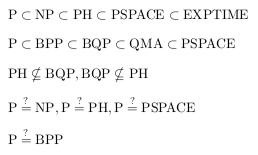 计算机科学家已经证明,PSPACE包含PH,PH包含NP,NP包含P。然而,对于P是否等于NP,是否等于PH,是否等于PSPACE,计算机科学家始终一筹莫展。P=NP问题是克雷数学研究所发布的七道难题之一,可以进一步阅读《一个价值百万美金的问题》了解更多。