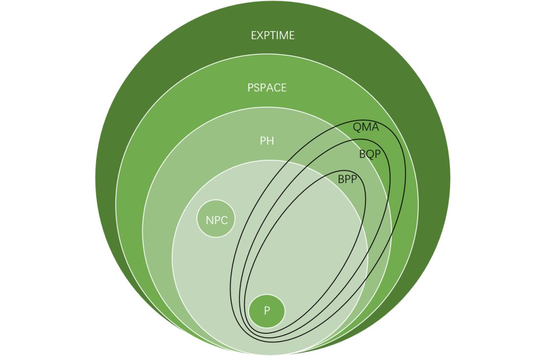 ○ 计算复杂度地图上一块新区域:上文提到的五月底的研究,证明了存在属于BQP,却不属于PH的问题。(注:P-经典计算机能够快速解决的问题;NP-经典计算机就能够验证正确性的问题;NPC-NP完全问题;BQP-量子计算机能够有效决的问题。)