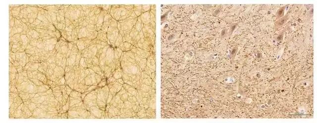 下图呈现了一幅直径10亿光年的宇宙物质的模拟分布图,以及一只4微米宽的人类小脑的实像图片。