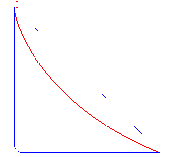 最速曲线的形状接近那个「跳台滑雪」(上图第三个),起始近乎的垂直加速让珠子获得了快速通过后半程水平位移的能力,平均速度最快。上图的动画里,红色的就是那条「最速曲线」。(伽利略的结论错在认为完美的圆弧才是最快的路径。)