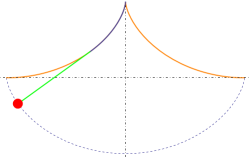 想象你的车跑在这样形状的一个坡上,轱辘就是那个黑点,那它运动速度最快的区间就是在这条摆线的 0≤θ≤π 的范围里,从垂直下降到回归水平位置的这段路径上(见下图)。