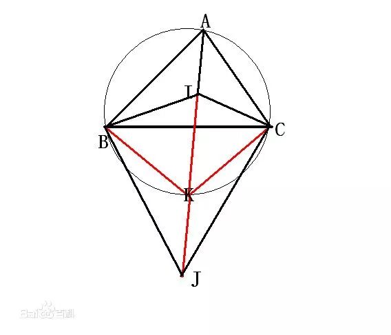 8.鸡爪定理(我也想知道有没有好听一点的名字啊亲~):设△ABC的内心为I,∠A内的旁心为J,AI的延长线交三角形外接圆于K,则KI=KJ=KB=KC。(注意红线的形状)