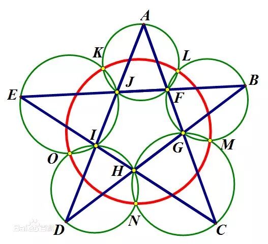 江主席出的这道平面几何题用规范的数学语言表述是这样的:在任意五角星AJEIDHCGBF中,△AFJ、△JEI、△IDH、△HCG和△GBF各自的外接圆顺次相交的交点分别为K、O、N、M、L。求证:K、O、N、M、L五点共圆。(确实很神奇~~)