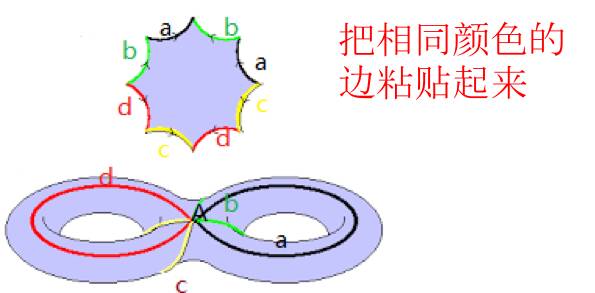 小强这下有点明白了。他立即反驳道: “如果我在通常的平面拿一个八边形按照图中的方法粘起来,也能得到亏格2的曲面啊?怎么能体现出双曲几何的特殊性呢?”