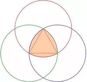 像上图这样把 3 个等半径的圆重合起来,两两互相经过圆心, 3 个圆相交的部分就是勒洛三角形,或者其发现者所称的“曲边三角形”。 如果不幸碰到这样的一条曲线, NASA 的工作人员无论怎么测直径,得到的结果都会是一样的。