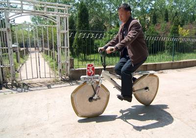应用上面滚木的原理,可以制造出许多有趣的小玩意。例如我国劳动人民就充分发挥聪明才智制造了一辆利用等宽曲线轮的 角轮自行车 ,据说已经成功申请专利了。