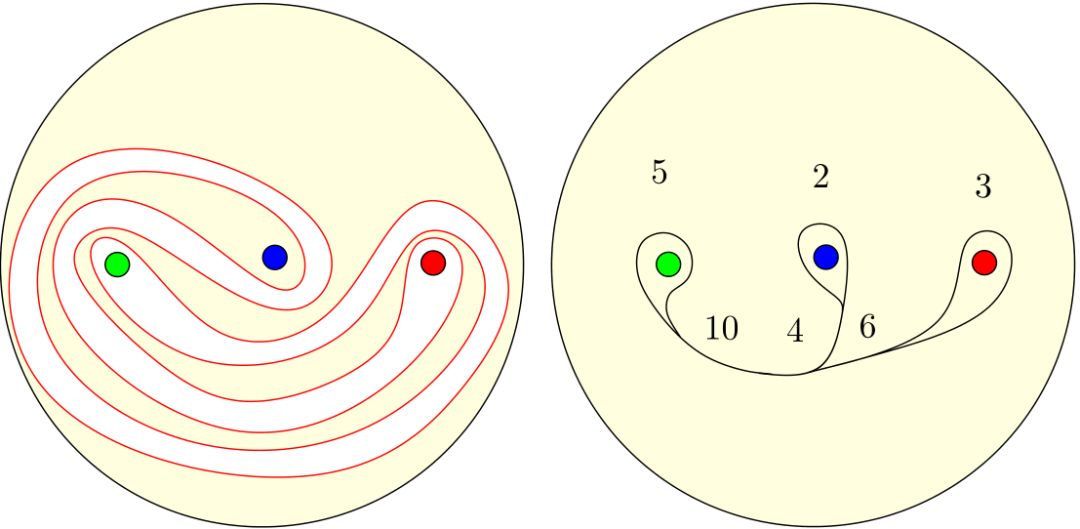 我们将咖啡表面视作圆盘上去掉三个点,每次搅拌看成一次自映射,封闭曲线在自映射的迭代下变成另外一条曲线。如图(5)所示,我们在咖啡表面上将彼此平行的曲线段捏在一起,得到一个分支(branch),分支的权重等于多少股被捏成这条分支。分支在道岔(switch)处汇合,两条驶入分支汇聚成一条驶出分支,驶入分支的权重之和等于驶出分支的权重。图(6)左帧的每条竖线代表一条分支(branch),竖线和曲线的交点个数等于这一分支的权重。这样我们得到了所谓的火车道(train track)模型。这个火车道实际上只有两个独立变量a和b,其他权重都可以由(a,b)推出。