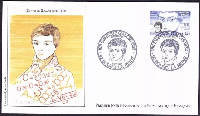 伽罗瓦在18岁时便发现了后来以他名字命名的理论,并解决了多项式是否可解的问题,然而他的论文因为太过超前未被当时人们理解并被拒绝发表。他于20岁时便死于一场传闻是与情敌间的决斗。在决斗的前夜,他似乎就预感到了自己的死亡,因此他将他的数学思想连夜写下来寄给了一位朋友,而这些思想在他死后几十年才渐渐地被人们吸收。