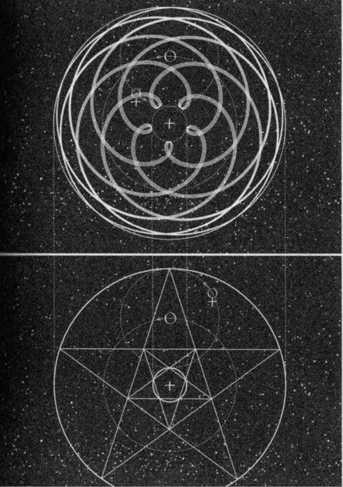 《达芬奇密码》一书通篇贯穿了神圣几何学思想。兰登向索菲讲述的关于所罗门神殿的文字,就是利用了神圣几何学的知识。还有雅克·索尼埃在临死前将自己的身体摆成五角星的形状,也是一个古老的神圣符号。作为一个符号学研究者,兰登在这方面是个专家。