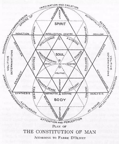 “既然这些现象的多样面向是因为振动,那么我们正面对着一个频谱,这频谱揭露了有图案的、象征的型态在其中一极,动能动力过程在另一极,整体是由本质上的周期所产生及维持的。”