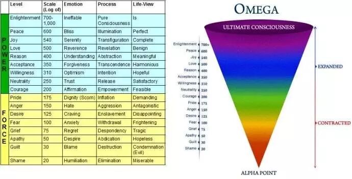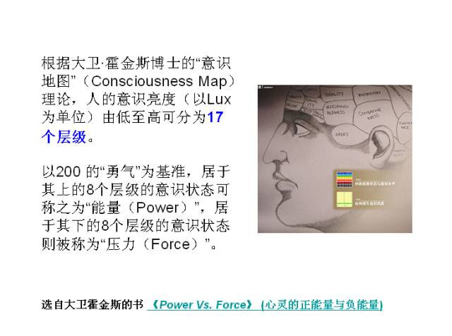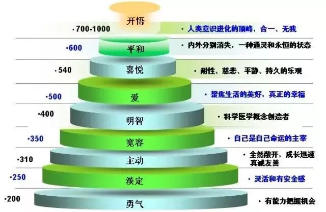 经过30年的临床实验后发现:人类各种不同的意识层次都有其相对应的能量指数,人的身体会随着精神状况而有强弱的起伏。