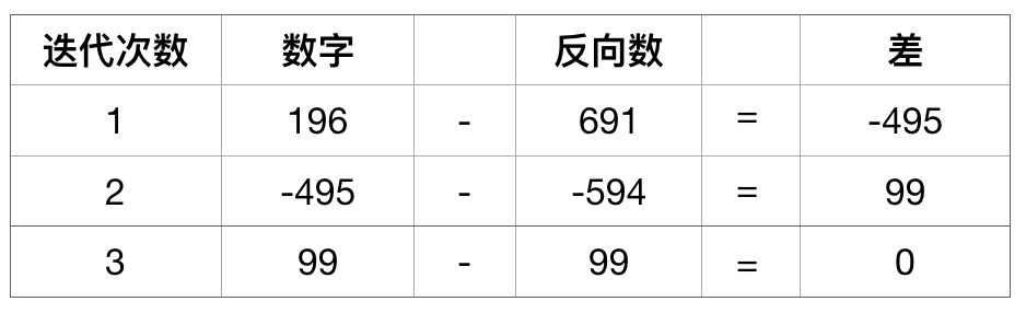 换种思路,如果不取两个数字之间的和,而是取两数间的差会发生什么?再以196为例,若将196进行“反向-相减”迭代过程,我们会得到一个回文数,再然后便得到0,进一步迭代只会产生更多的零。