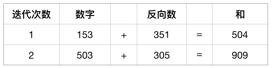 先想任意一整数,将这个数字按相反的顺序重新排列得到另一个数字,再把这两个数字加在一起,得到的和是不是一个回文数呢(顺读和倒读都相同的对称数)?如果不是,那请将新得到的数字重复这个过程,反向、再相加,直到结果为回文数为止。大部分数字只需通过少数几次这样的迭代步骤就能形成回文数,比如153,它只需要进行两次这样的迭代便可得到回文数909。