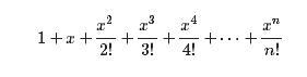的值,如果n比较大的话,你会发现结果几乎等于你得到的数ex,且添加的求和项数越多,两个结果越靠近。在某些时候,计算器上的两个结果是一样的,因为计算器无法检测它们之间的微小区别。当你对无穷多项求和时,两个结果是一模一样的。