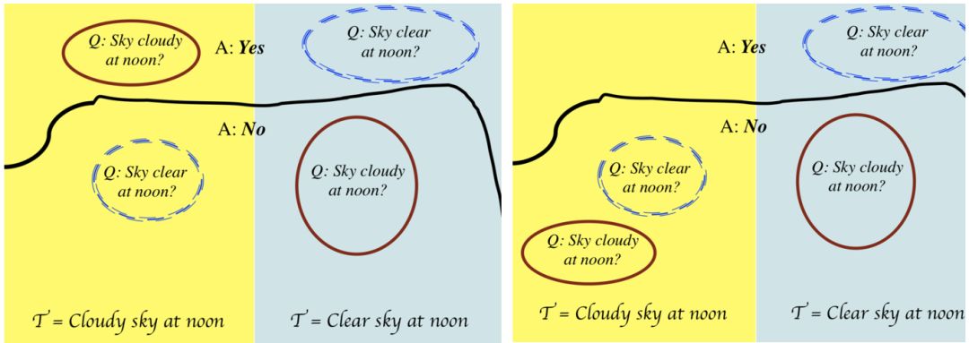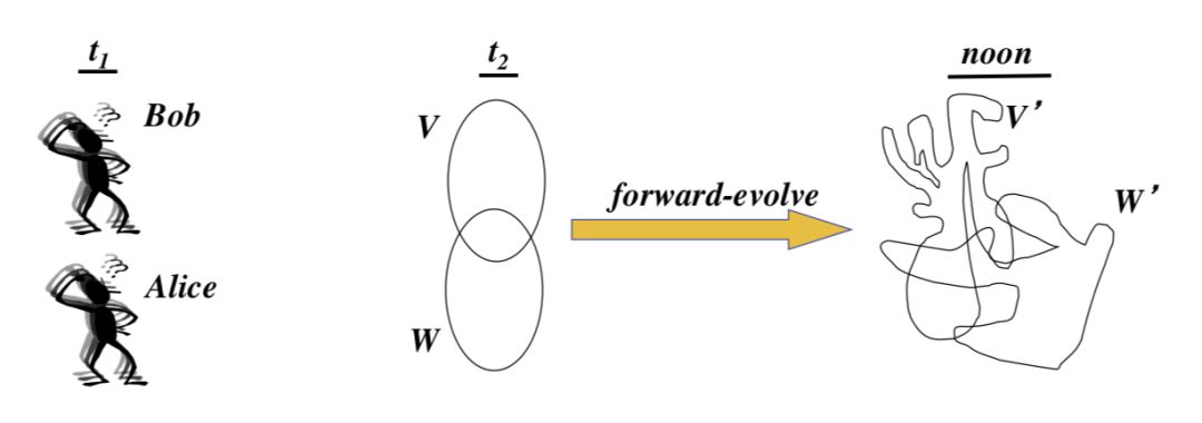 ○ 时间t₁小于t₂,t₂小于正午(noon)。V是Bob在所有的时间t₂对在t₁听到的问题回答“是”的宇宙集合,无论问题为何。W是Alice在所有在时间t₂对在t₁时听到的问题考虑回答“是”的宇宙集合,无论问题为何。V'是V向前发展到中午,而W'是W向前发展到正午。在t₁时,我们问Bob,“正午时宇宙会在W'吗?”(换句话说,Alice在t₂时是否在想‘是’?)。那时我们也会问Alice:“正午宇宙会在V’之外吗?”(换句话说就是,Bob在t₂时是否没有在想‘是’?)。Bob和Alice不可能同时回答正确,无论他们有着怎样的计算能力、或怎样的宇宙定律等等。| 图片来源:[1]