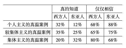 在集体主义的真温案例中,整个社区都拥有产生真信念的可靠机制。一个令人兴奋的实验结果出现了:32%的东亚人回答“真的知道”,这个比例要大于20%的西方人的回答,其结果与个人主义的真温案例正好相反。