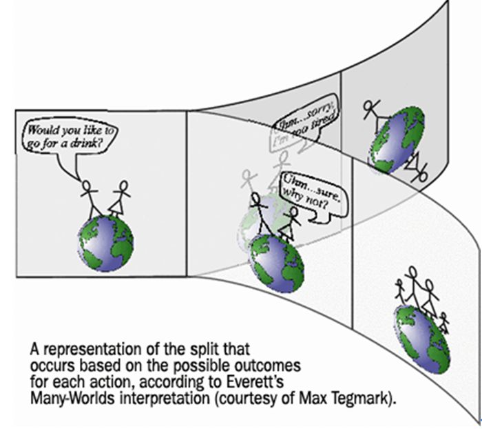 多世界理论的支持者说,系统与测量仪器或者环境的量子纠缠态所描述的每一种可能都是真实存在的,或者说,世界劈裂成多个世界。对于每个世界而言,在下一次测量中,又会进一步劈裂成多个世界,如此等等。