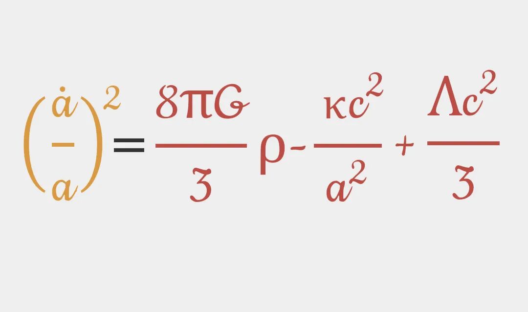在弗里德曼推导出的两个方程中,第一个更为重要。方程的一边告诉我们宇宙的构造会如何随时间膨胀或收缩。方程的另一边包含了所有的物质、辐射和其他任何组成宇宙的能量形式,也包含了空间的固有曲率(不同的曲率对应宇宙不同的形状),甚至包含了爱因斯坦曾为了保持静态宇宙在方程中引入的宇宙学常数(用“Λ”表示)。