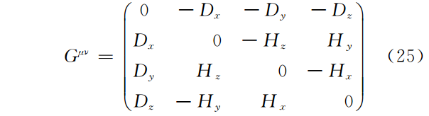 式(76)包含着权函数零头阶(分子电荷)、一阶(偶极矩)、二阶(四极矩)…第k阶(2k极矩)以及更高阶的贡献。类似地,对于每一阶我们都可以利用电流守恒,公式(58)以及上一阶计算留下来的项凑出一个矢量Rk贡献的电流密度项:[size=1em]与闵可夫斯基公式中的D,H不同,这里的D′,H′包含着介质运动的贡献。这样运动介质中麦克斯韦方程组的形式与闵可夫斯基公式就相同了。而实际两种模型D,H与D′,H′不相等造成的观测效应非常小(偶极矩、四极矩效应等)。这也意味着,介质运动产生的额外效果可以统一吸收到本构关系中,麦克斯韦方程组形式保持不变。而将D′,H′组成协变张量Gμ ν就可以在做不同参考系变换时处理介质效应。如果要求理论是相对论理论的话,那本构关系的参考系变换其实就成了问题的关键。在下一节中,将据此给出运动介质中协变的本构关系。