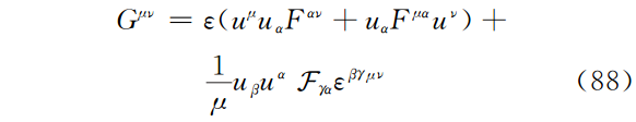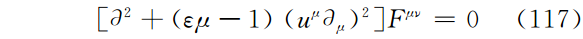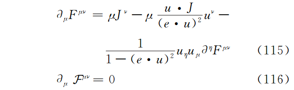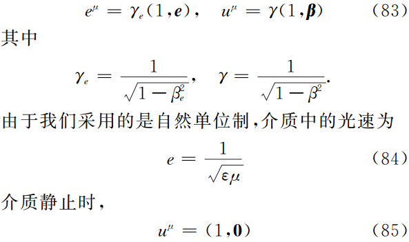 [size=1em]方程组(109)~(112)不是明显协变形式的,我们还可以将其写为四维形式。使用方法和我们前面推导协变本构关系的方法相同,用协变张量、矢量凑出介质中的麦克斯韦方程组。放弃Gμν只使用协变张量Fμν、Jμ、介质中的光速eμ与介质的运动速度uμ等凑出协变形式。注意到介质静止时,光速只能用到γe与e,而与e的方向无关。γe可以由 [size=1em] [size=1em]得到,而e则可以用γe算出 其他过程与协变本构关系的凑法类似,这里就省略了。最终得到的运动介质中麦克斯韦方程组的四维协变形式为这个仅关于Fμν的方程正是我们期望的,读者可以验证该协变方程组与式(109)~(112)完全一致,且形式简洁。在规范理论中,Fμν就是规范场场强。这个运动方程的分析力学推导比较复杂,因为此时有一个拉格朗日密度,又有一个统一的介质运动速度uμ(构成有限个自由度拉格朗日量),所以我们就不讨论其分析力学形式了。可以看出,式(115)后边除了第一项外,其他项一部分源自于自由电流,一部分源来自于电磁场本身,且二者都与介质的运动相关。第2节中所讨论的本构关系(20)则没有速度项,这说明从微观的角度分析介质效应也存在一定的局限性。原因在于第2节微观方法是非相对论的,因此得到的宏观本构关系也是非相对论的,其协变性质不清楚,用本节宏观办法,则可以弥补这个缺陷。