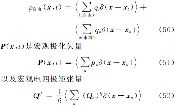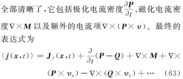 [size=1em]注意,这里的处理办法仍然是经典物理的方法,即我们认为物体可以分割成非常小的微元,微元的物理是经典的,它们的宏观效应可以通过大量微元叠加或者积分的方式获得。现代物理,在微观的尺度上,实际上应当用量子力学描述电子与核子的状态。利用量子力学中算符的期望值代替经典量时,二者近乎相等[1]。空间平均方法的详细内容,读者可参阅Russakoff[5];而Ian Murdoch更多的讨论了权函数的选择[6];对于极化与磁化的相对论修正,以及统计力学方法的引入,de Groot与Suttorp进行了全面的讨论[7];利用量子力学的方法处理微观电磁现象的内容,可参阅Mahan[8],Adler[9]。