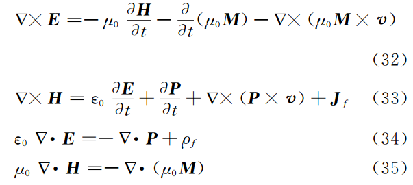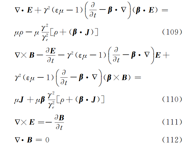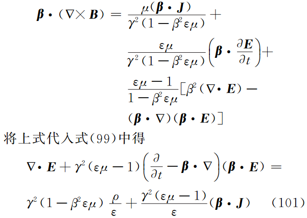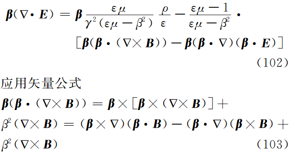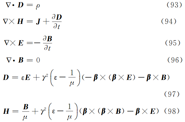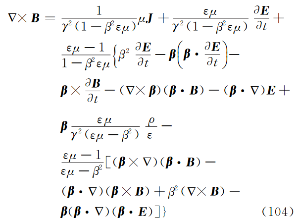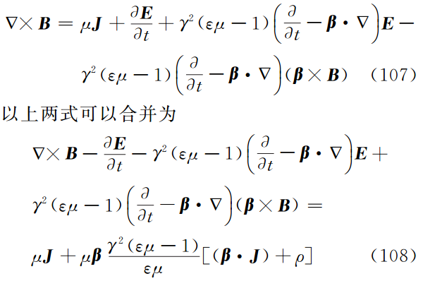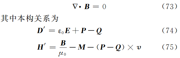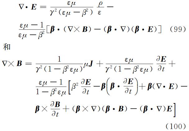 [size=1em]利用协变的本构关系式(91)、(92)消除了麦克斯韦方程组中的两个变量D,H,可得到的方程还很复杂,需要化简。因为洛伦兹平动方向为x负方向,关于B的矢量式中,第三项的中括号内,第一、二、三项只有x方向上有分量,第四、五项则没有x方向上的分量,因此在式(99)中, [size=1em]上式揭示了运动介质中束缚电荷的形式。通过式(99)与式(100)的互相代入,得到了运动介质中负责电场的源,它不仅仅与自由电荷相关,还与介质的运动效应相关。磁场的源也可同样得到,为此,在式(99)两边乘以速度矢量β 因为式(102)仅在x方向上有分量,yz方向不需要考虑,将式(102)、(103)代入式(100)中,经整理得到上式揭示了运动介质中的磁化电流形式相当复杂,方程右边的各项中,含有B的项都没有x方向上的分量,平动速度β的项只有x方向上的分量,因此不容易整理得到一个完整的公式。但是若把每一方向上的分量都列出,就可总结出它的一般表达式。[size=1em]x方向上,式(104)大括号内只有E的贡献,然后写出 [size=1em]而式(100)yz方向上的表达式比较简单,可直接推出,结果为 [size=1em]经过复杂的推导,将式(104)化简与式(101)形式相似,得到了运动介质中B与它的源之间的关系。经过以上计算即可得到运动介质中完全关于(E,B)的协变的电磁学方程 这样就将静止介质中的本构关系式(20)、(21)写成了协变形式(91)、(92),代入麦克斯韦方程组中,便消除了原来公式中的两个电磁学变量D、H,同时原来的6个方程,现在只剩下了4个。在麦克斯韦方程组(109)~(112)中,只有两个电磁学变量E、B,因此不需要额外的本构关系。可以清楚地看出,介质的运动额外造成的束缚电荷与磁化电流表述在式(109)、(110)中。它们是关于β以及γ的项,当β=0时,便回到了闵可夫斯基公式。