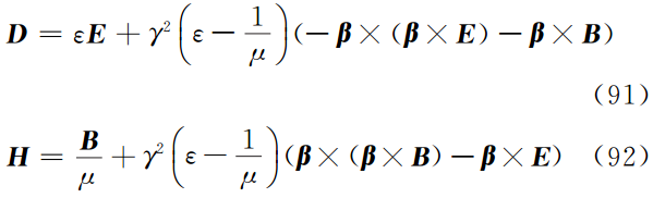 [size=1em]这一组方程就与杰克逊电动力学中的形式一致了。这也是大多数教科书处理介质电磁场变换的公式,需要强调一点的是上文协变关系式(88)~(90)形式更为简捷明了。