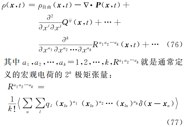 应该注意到以上理论相比与朱公式(32)~(35)多了四极矩的贡献。其实可以类比上文的处理办法给出更高阶的修正,其形式一般都可以化为某个多出来的矢量叉乘介质速度的形式。这是因为宏观电荷密度的高阶修正正是权函数的各阶泰勒展开式之和,即