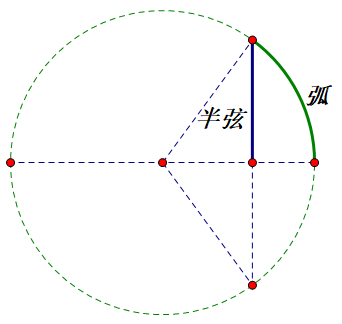 3 半弦表公元6世纪,印度数学家阿耶波多沿用了希帕科斯弦表的思想,进一步制作了半弦表。在其中他把弦所对的弧的一半与半弦对应。观察下图,你是否觉得有些熟悉?没错,我们知道在单位圆中,这里的半弦也即为正弦。因此印度数学家发明的半弦表非常接近现代数学中正弦的定义。随后几百年,文明的交流使得半弦表在阿拉伯、印度、中国等地区广为流传,同时还首次出现了余弦、正切等三角学概念。