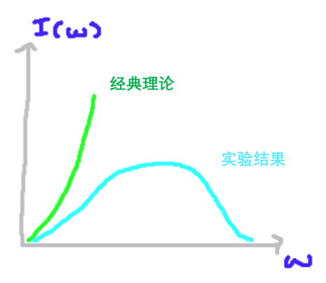 首先,用一些深色的材料制作一个黑体,然后准备一个可以检测任何辐射的频率和强度的探测器。在实验过程中,除了黑体发出的辐射外,没有其他辐射。收集了所有实验数据后,我们将探测器探测到的辐射强度与黑体发射的辐射频率画成下面的关系图,并与经典理论的预测值对比。如果用温度更高的黑体重复实验,会得到形状相似、但峰值更高的曲线。