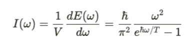 最后,经过一些推导,我们会发现,普朗克用来拟合黑体辐射实验数据的结论已经呈现在我们面前。光强 I作为角频率的函数,可以表示如下: