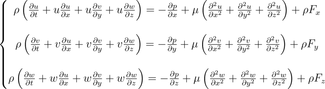 第二个方程实际上是三个微分方程组成的方程组,可以被看作流体的牛顿第二定律。如果我们将表达式展开,就可以得到一个复杂的方程组: