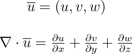 现在让我们谈谈数学。字母u表示流体的速度矢量,它有三个分量,我们可以把它们分别称为u,v,w,表示速度在x,y,z三个方向上的分量。希腊字母nabla∇ 加上一个点乘符号代表散度算符,表示在各个方向上对矢量的分量做微分操作