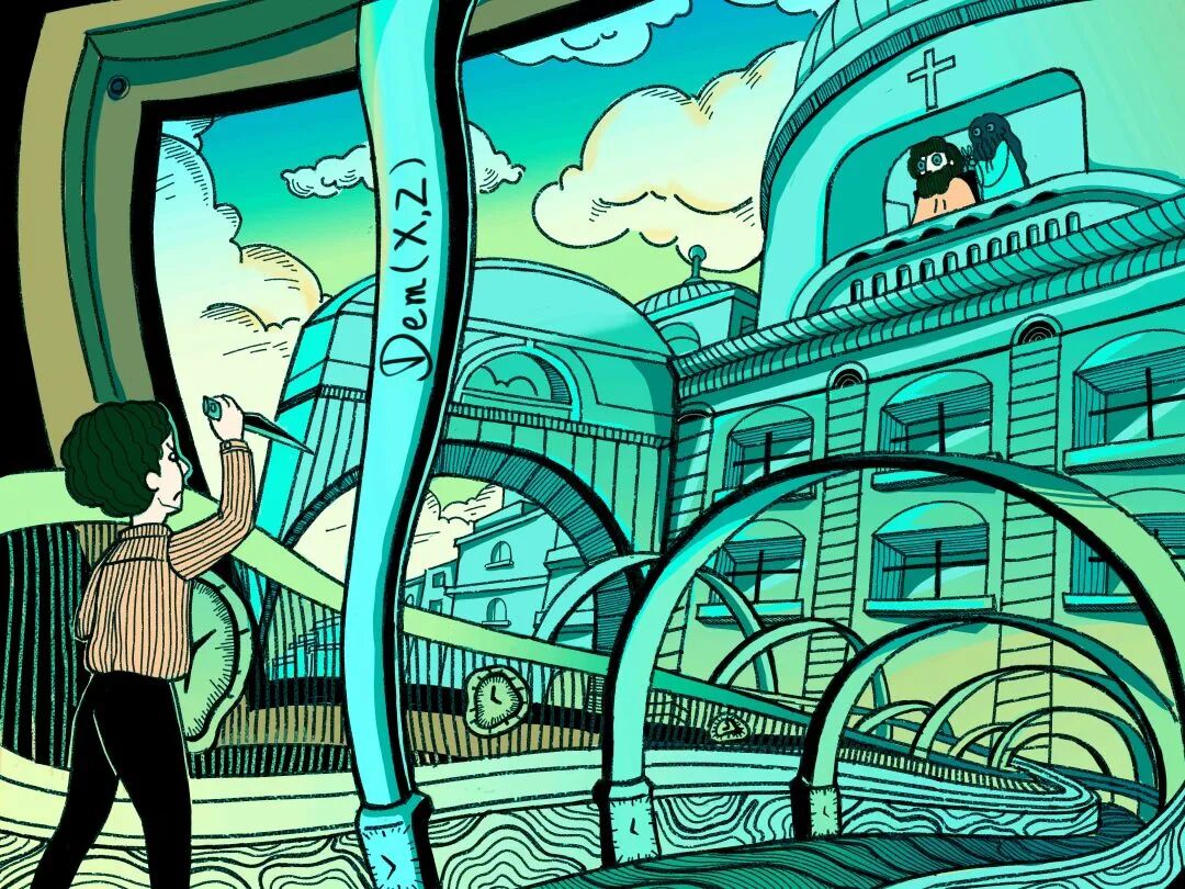 插画之外,一名男子对着画作中正在理发的理发师举起了刀,但实际上我们无法分辨出持刀男子是在画中还是画外,即男子的存在性在这个系统中无法证明为真,也不能被证明为伪。