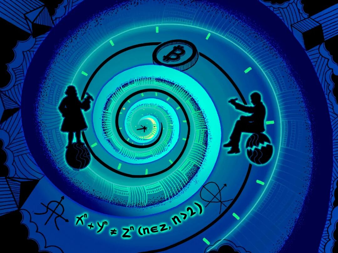 圆盘右侧坐在破碎金蛋上的是怀尔斯,358年智力接力赛由他终结,但“金蛋传奇”仍在继续,椭圆曲线便是其一,它在非对称加密领域大放异彩,被密码学朋克们应用于比特币,使比特币成为数学上牢不可破的“数学黄金”。