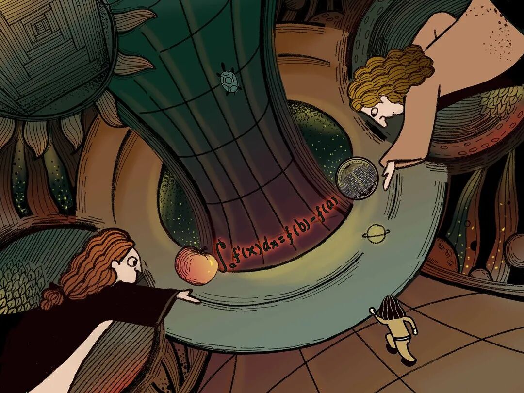 插图左侧抛出苹果的是牛顿,与之相对的则是抛出“二进制”的莱布尼茨。在苹果与“二进制”之间,则是著名的微积分公式。