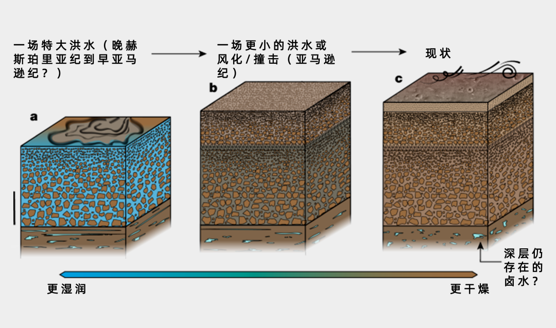 火星乌托邦平原南部历史改造的概念模型。(图/Li, C. et al., Nature, 2022)