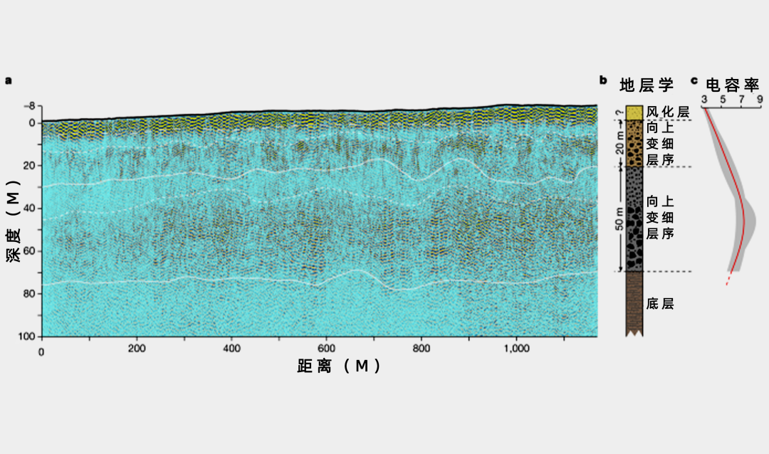 在30到80米之间,还有一个更古老、也更厚的第三层,它呈现出了与第二层类似的反射变化模式,但反射更强一些,平均电容率的数值也更高,这说明,这一层存在更大的岩块,分布也更均匀