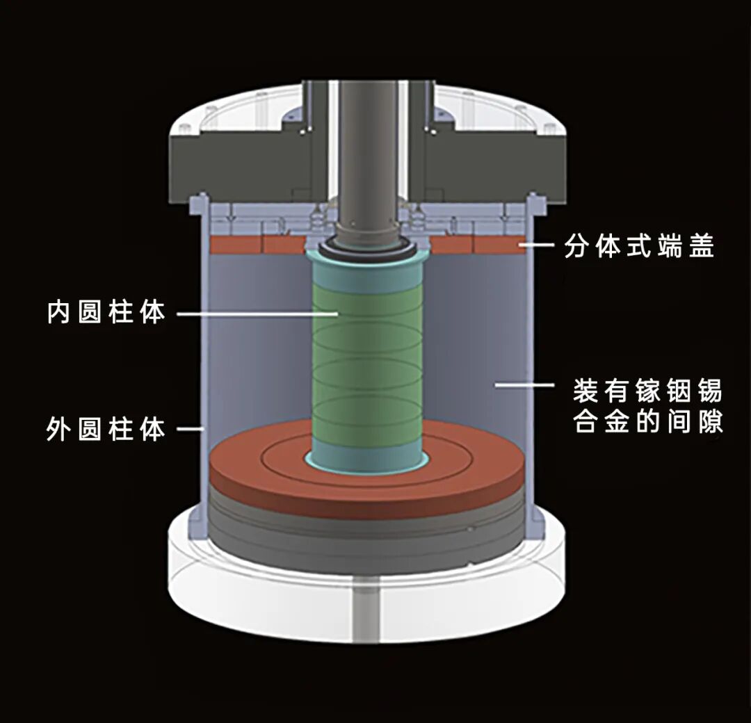 在两个圆柱体之间的间隙中充满了一种名为镓铟锡合金的液态金属合金。这是一种黏度大约是水的2倍,但电阻率约为水的亿分之一的材料。如此低的电阻率意味着在这种流体中,流动的电流对其运动有着非常重要的影响。