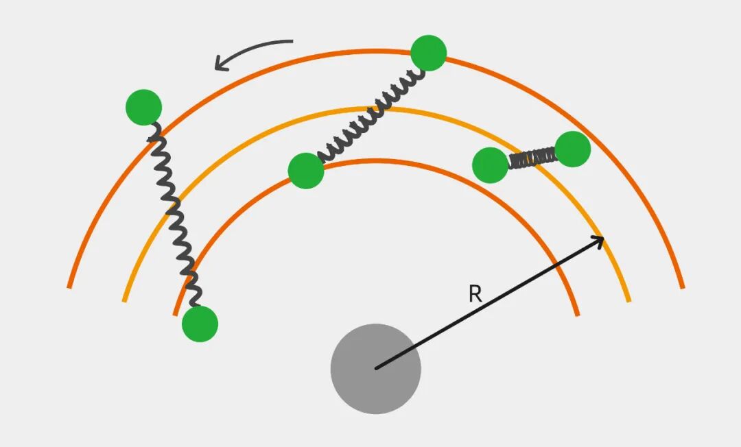Balbus和Hawley提出,无论是在等离子体还是液态金属中,磁场的存在会使得这些导电流体像被弹簧连接了一样,产生湍流,使角动量可以在吸积盘的不同部分之间传递。上图显示了在垂直磁场中的SMRI:图中的绿色小球代表了吸积盘中的导电流体,它们绕灰色的大质量天体运动,在轨道上慢慢彼此分离。当存在一个垂直于屏幕的磁场时,绿色小球会在回复力的作用下,相互牵引,宛若被弹簧相连。由于不同的绿色小球处于略微不同的轨道上,因此引力会对其产生转矩,更靠内的小球旋转得更快,然后被“弹簧”拉回,失去角动量,向有着更小半径的轨道回落;更靠外的小球会被加速,获得角动量,向外移动。“弹簧”会被进一步拉伸,转矩会增强,两个小球会继续以更快的速度分离。(图/素材来源:Hung et al. / Nature)