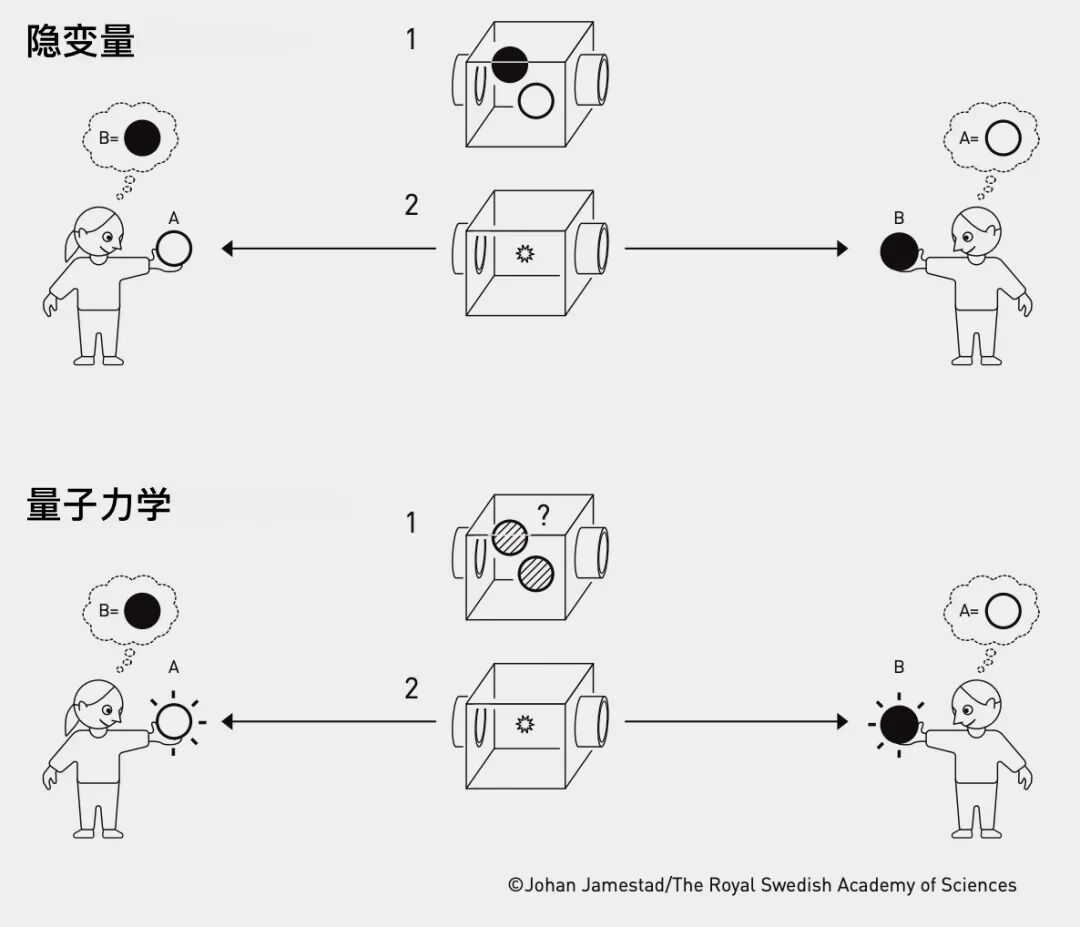 量子力学中的纠缠对可以比作一台机器,它向着相反方向抛出反色的球。当Bob抓到一颗球,并看到它是黑色的时,他就立刻知道Alice抓到了一颗白色的球。在一种使用隐变量的理论中,这些球总会包含着关于颜色的隐藏信息。但是,量子力学认为,这些球都是灰色的,直到有人看到它们时,其中一颗会随机变成白色,另外一颗则变成黑色。贝尔不等式表明,有一些实验能够区分这些情况。这类实验已经证明了,量子力学的描述才是正确的。
