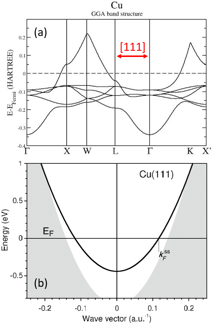 (3)  当然,Cu (111) 表面的电子也不能脱离表面跑到真空或者空气中。因为功函数的束缚,电子不能逸入真空。因此,Cu (111) 表面的电子实际上就是一层平行于表面运动的二维电子气,类似于调制掺杂的界面。