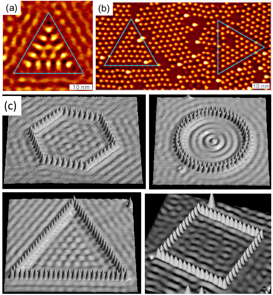 图6. 三角形纳米围栏中的原子结构。(a) 三角形围栏内的费米能级附近局域电子态密度图。(b) 三角形围栏的方向对内部 Gd 原子六角结构方向的调控。注意到,这里的态密度分布呈现的三重对称性并非源自 Ag (111) 面的 Ag 原子排列之六重对称性排列,因为态密度分布图中的振荡周期 (特征尺度) 比 Ag (111) 面的原子间距大得多。(c) 取自文献的几个实验观测结果,显示出围栏对称性对围栏内局域电子态密度形态的调控 (https://www.pinterest.com/pin/143130094392366755/)。