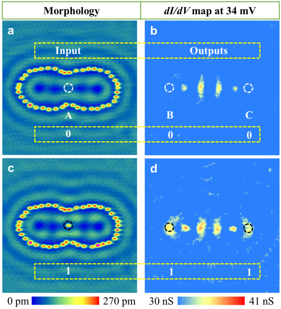 图9. “扇出门”器件的构造与工作。器件由两个椭圆形量子围栏叠加而成,它们具有一个共焦点,形成一个特定的哑铃型围栏或称共焦椭圆围栏。(a) 空的共焦椭圆围栏 STM 形貌图;(b) 相应的 dI/ dV 谱图;(c) 共同焦点 A 处有一个 Fe 吸附原子时,对应的 STM 形貌图;(d) 相应的 dI / dV 谱图。椭圆尺寸为 a = 6.6 nm, e = 0.7。椭圆围栏焦点由虚线圆圈标出,其中黑色表示 1、白色表示 0。来自文献[Nature Commun. 11, 1400 (2020)]。