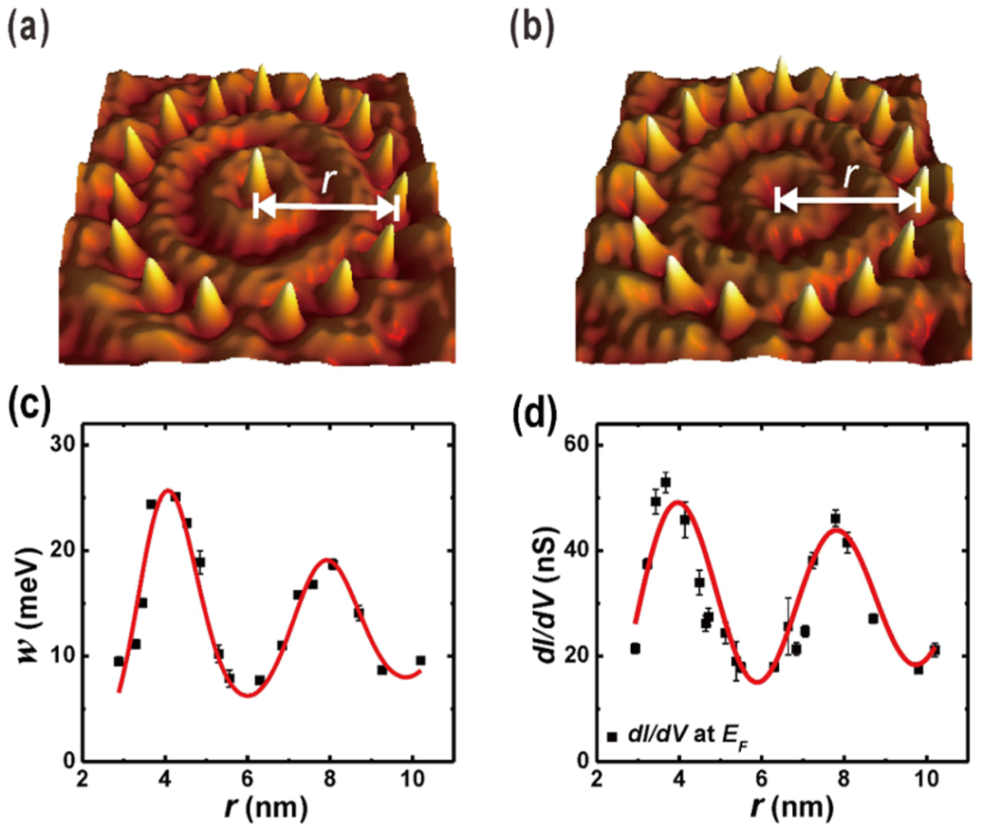 图8. 纳米围栏对近藤共振宽度 w  的调制。图 (a) 和 (b) 分别为中心有 Co 原子和中心没有 Co 原子的 Co原子围栏之 STM 形貌图。(c) 围栏中心 Co 原子的近藤共振宽度 w  随围栏半径 r 的依赖关系。(d) 中心为空的 Co 原子围栏的局域表面态密度 (费米能级处的扫描隧道谱 dI / dV 与围栏半径 r 的关系。红色曲线是拟合结果。参考文献 [Phys. Rev. B 97, 035417 (2018)]。